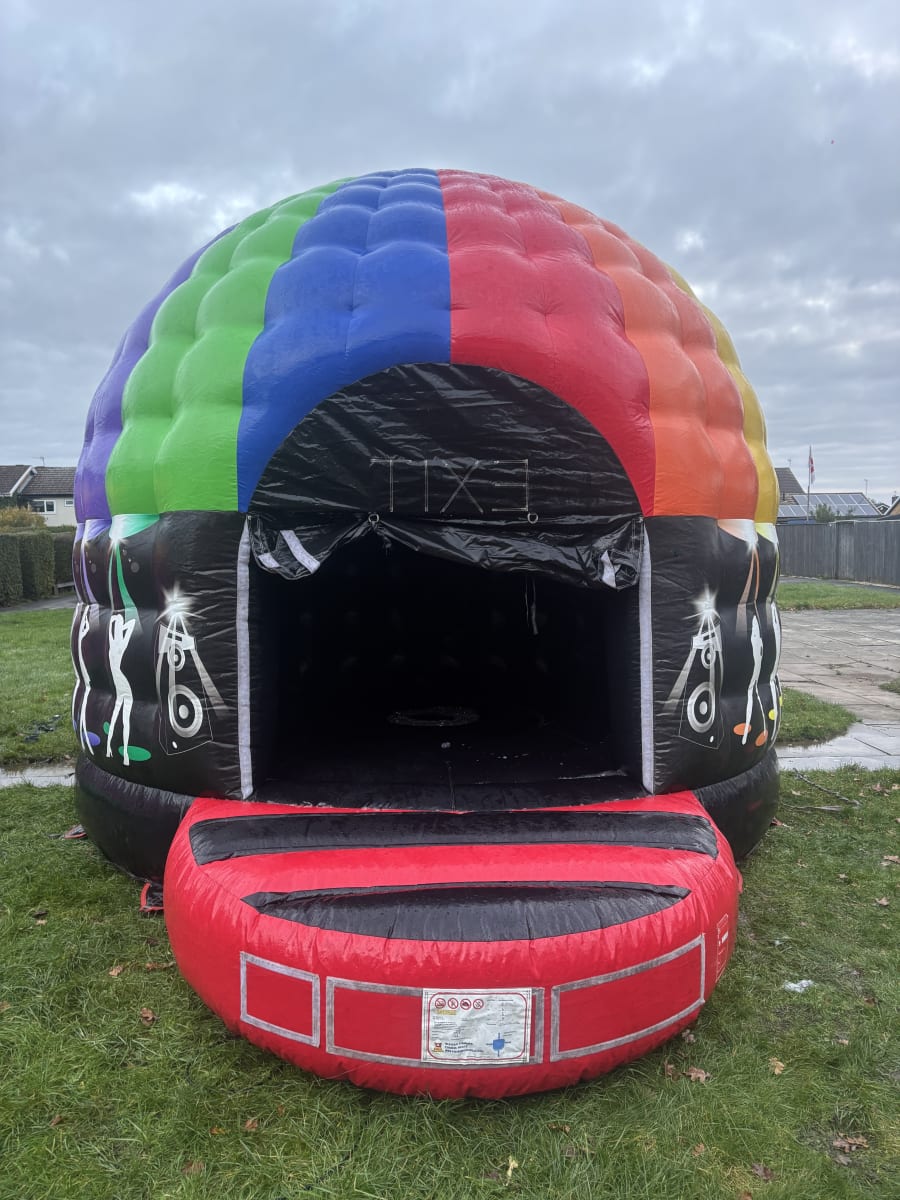 This is an inflatable disco dome bouncy castle featuring a rounded, dome-shaped design with brightly coloured roof panels in green, blue, red, and orange. The front has an arched entrance with a small inflatable step, and the exterior is decorated with party-themed graphics such as dancers and speakers. The inside is dark, creating a nightclub-style atmosphere—typically used with lights and music for parties and events.