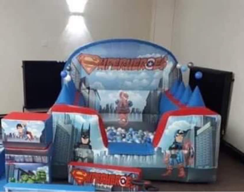 Superhero ball pool .. our brilliant Superhero Ball pool with air jugglers will give endless amounts of fun and joy. With the most favourite superhero characters; Batman, Spider-Man and of course Superman all printed on this Softplay ball pool Your little superheroes will be mesmerised. Why not add our Superhero soft play to the to complete the package! Or if you do have that extra space you can even add our to have the ultimate party package! Our brightly coloured red and blue inflatable superheros Ball Pool is a great item to be hired out in a package with any of our bouncy castles but we recommend either superhero bouncy castle or Superhero Softplay