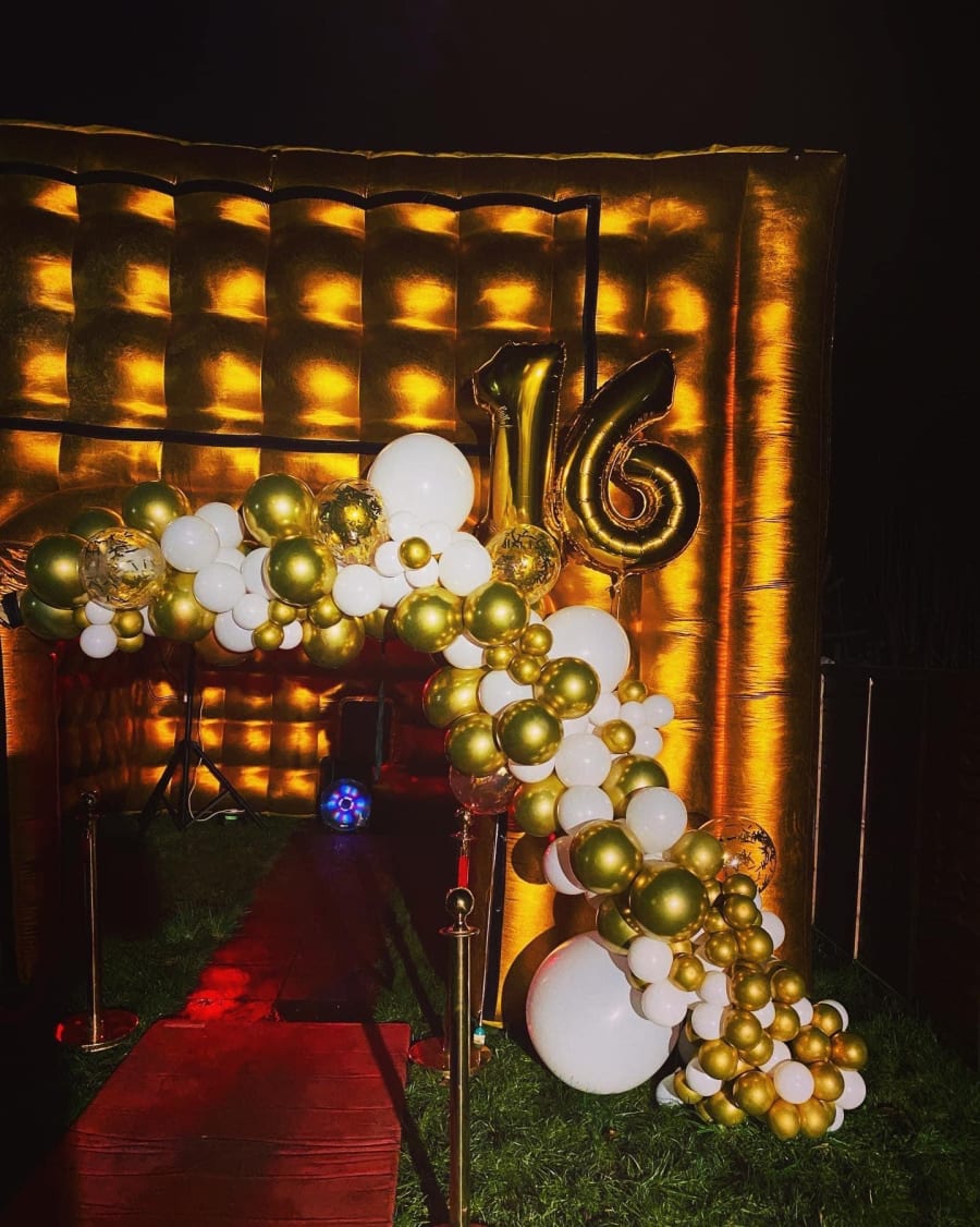 Gold rave cave Big N Bouncy Castle hire introduces our popular gold cube with a sloped roof. The gold cube has definitely been proven to be one of our most popular nightclubs so we made sure to get others but with a few changes and various colours such as chrome silver, & black The sloped roof will make sure it can be used in sunshine or rain as the rain will run straight off the roof rather than holding it so your party can go ahead no matter the weather. Included in the hire are laser lights, a smoke machine, disco lights and a bluetooth speaker which just connects up via your phone or laptop. Once the cube is set up a member of the team will connect your chosen device up to the speaker for you and away you go! Choose your own music and enjoy your night partying in your back garden! Please be aware the nightclubs are overnight hire only. What we provide ◦ Inflatable cube ◦ Blower ◦ 1x 25metre extension leads ◦ Lasers & stand ◦ Bluetooth speaker ◦ Fog machine & liquid ◦ Vip red Matt ◦ Vip barriers